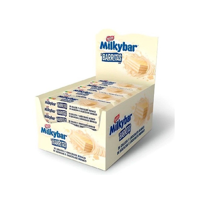 Caja de 30 unidades de Nestlé Milkybar Snack, barritas individuales de chocolate blanco con textura crujiente de galleta o barquillo.