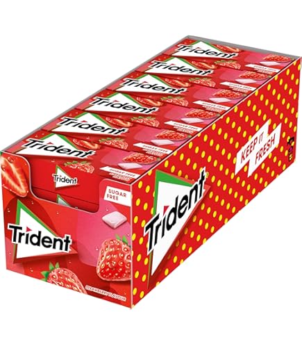 Chicles sin azúcar con sabor a fresa, en formato de láminas. Caja de 24 unidades ideal para disfrutar de un sabor dulce y refrescante en cualquier momento.