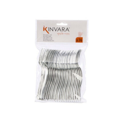 Set de 24 tenedores de postre fabricados en plástico resistente con acabado plateado. Su diseño elegante imita el brillo del metal, ofreciendo un toque sofisticado y práctico para cualquier ocasión. Ligeros, reutilizables y fáciles de limpiar, son ideales para celebraciones, eventos, catering o uso en el hogar sin renunciar a la estética.